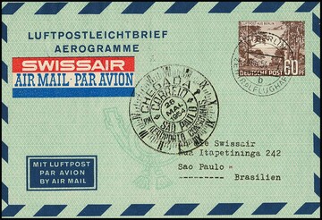 1954, Luftpost-Faltbrief-Ganzsache 60 Pfg. gelaufen von Berlin-Zentralflughafen über Zürich (rs. Stpl.) nach Sao Paulo/Brasilien mit Ankunftsstempel. Mi. 600,-