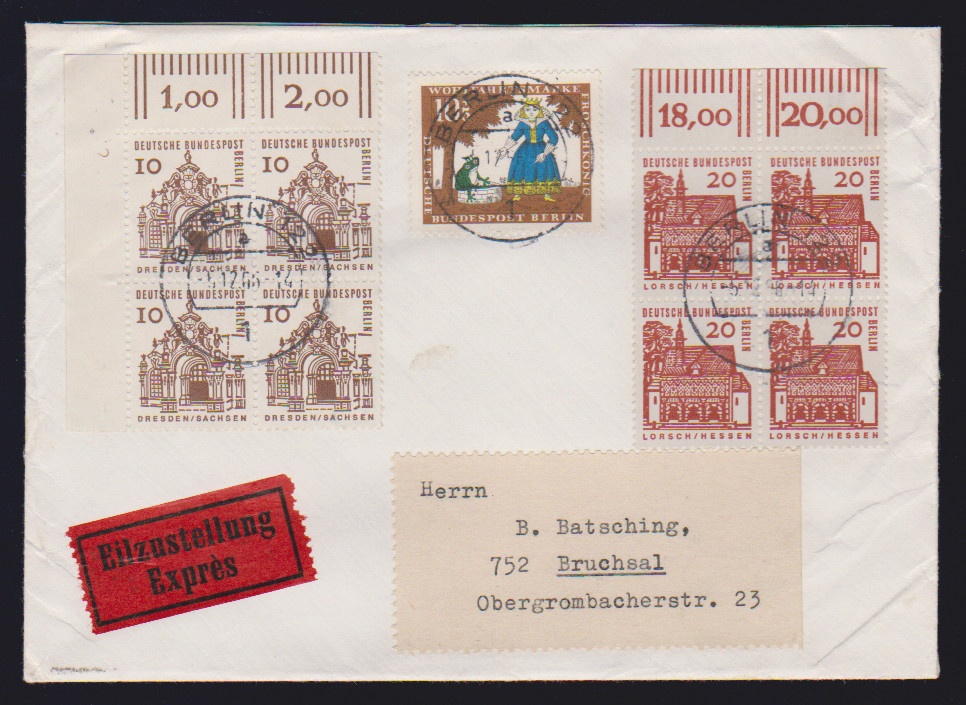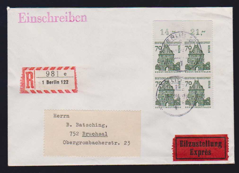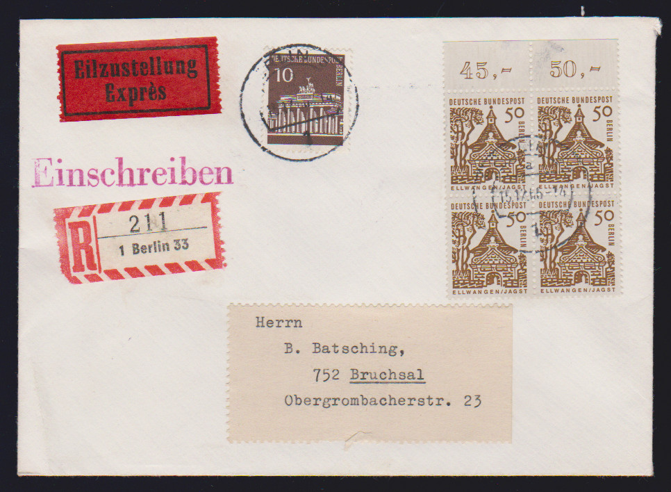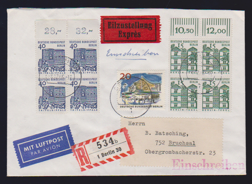 80 Pfg. kleine Bauwerke im waager. Paar als seltene MeF auf Übersee-Lupobrief (Mi. alleine 350,-), ferner Paar 50 Pfg. in MiF auf Brief, R-Brief mit drei OR-Stücken 20, 50 u. 100 Pfg. Brandenburger Tor, sowie 30 Pfg. als RE + 4 LF auf Brief