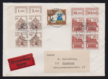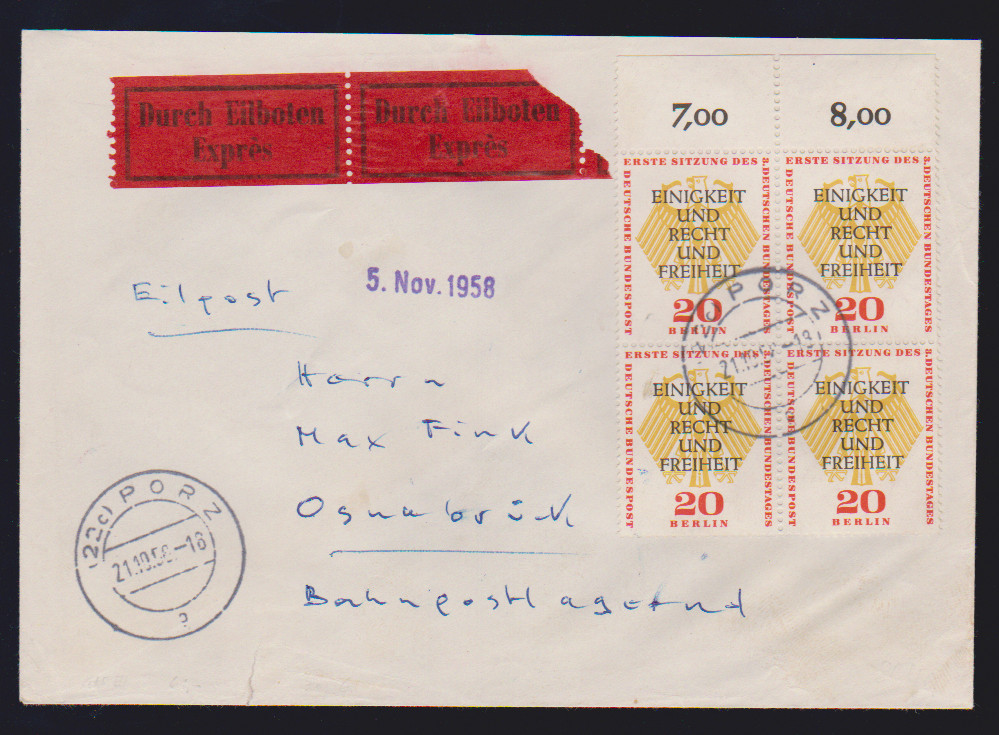20 Pfg. Bundestag im Oberrand-Viererblock auf Expreßbrief (unten kl. Randriß) aus Porz 1958