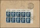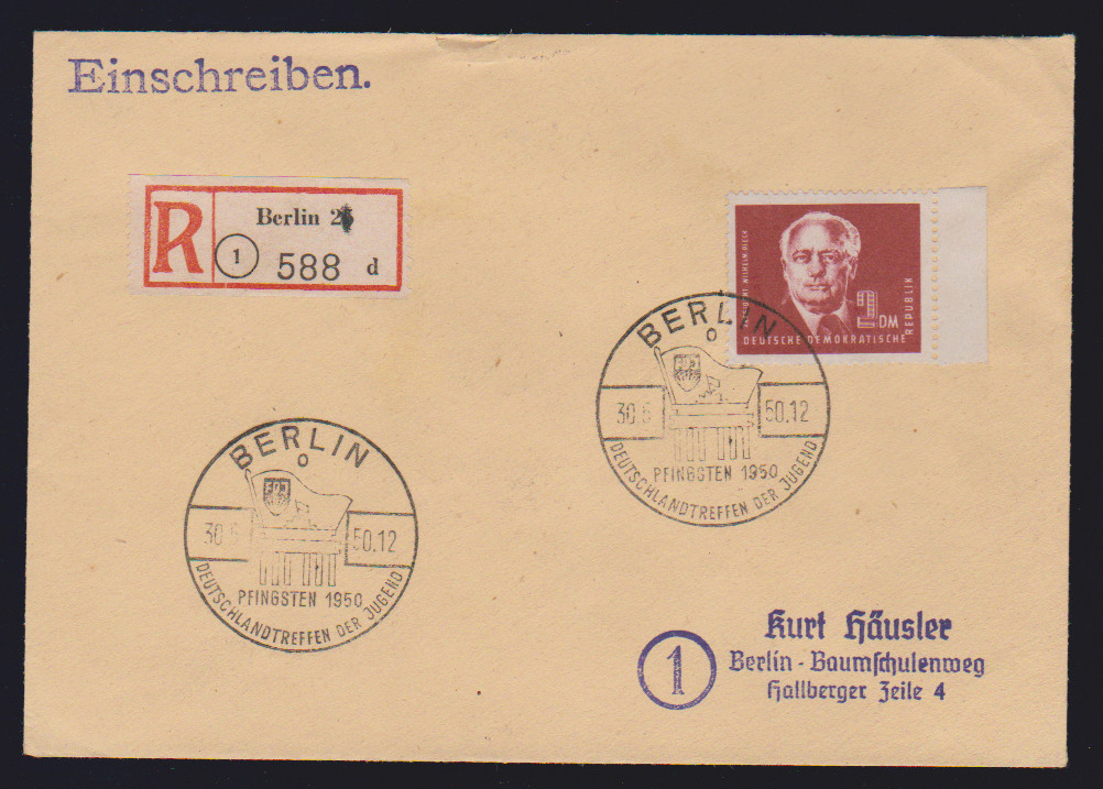 12 Pfg. Pieck I, Einzelmarke vs., Eckrand-Zehnerblock re. o. rückseitig, als hohe reine Mehrfach-Frankatur von 11 Ex. auf portoger. Orts-R-NN-Doppelbrief aus Berlin (von der Versandstelle)