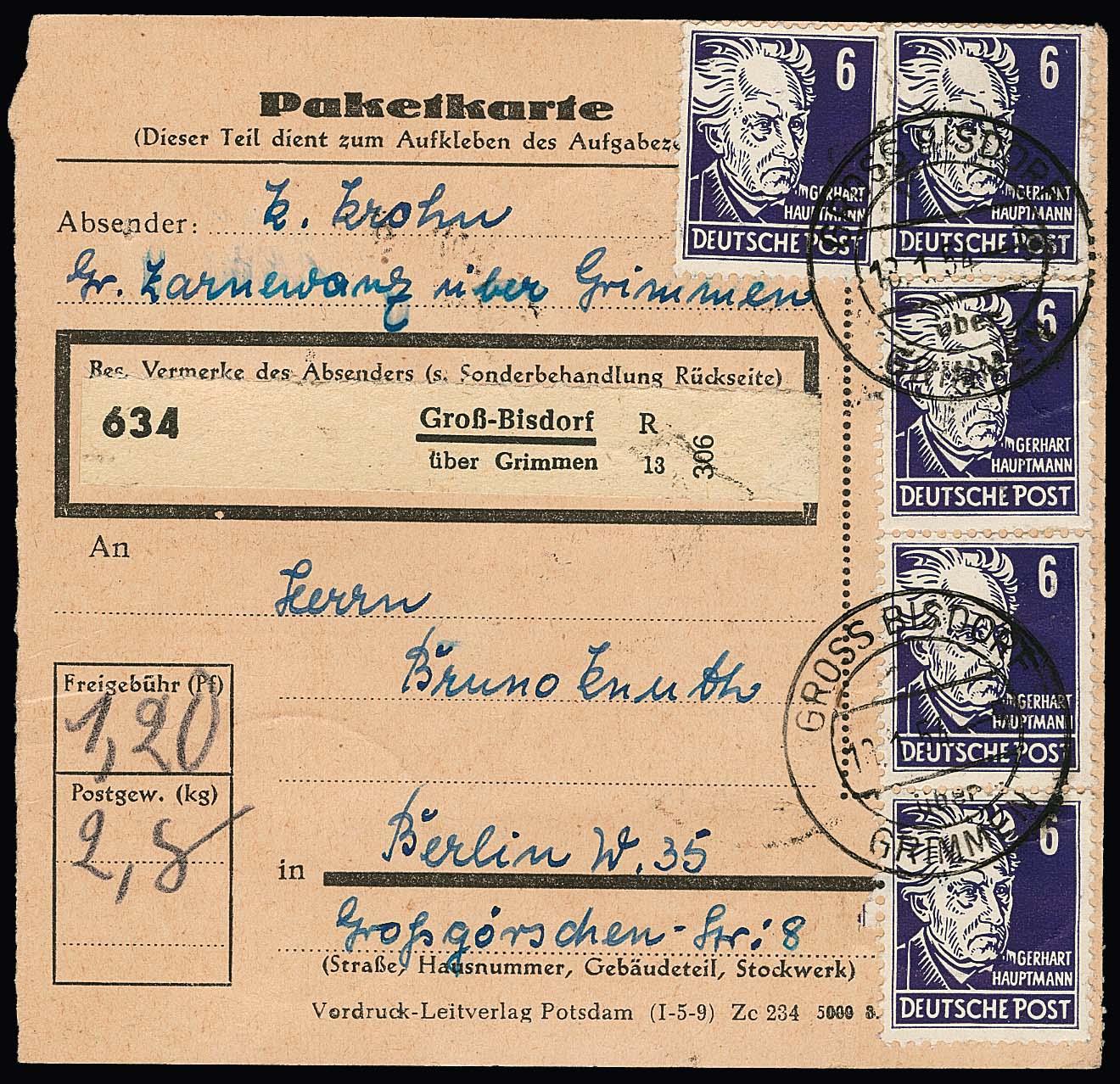 6 Pfg. Köpfe II 20mal vs./rs. als Mehrfach-Frankatur auf Paketkarte aus Groß-Bisdorf (ein Wert ein Fehlzahn), seltene hohe MeF!