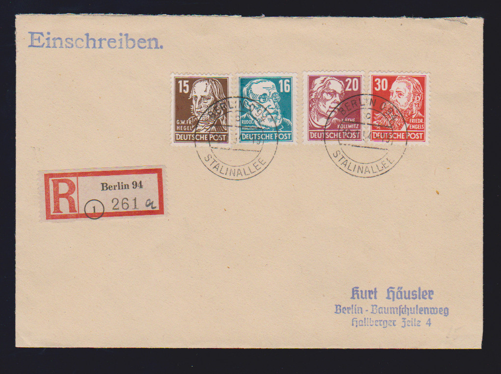 15, 16, 20 u. 30 Pfg. Köpfe II auf schön gest. ("Berlin 094 Stalinallee") Orts-R-Brief