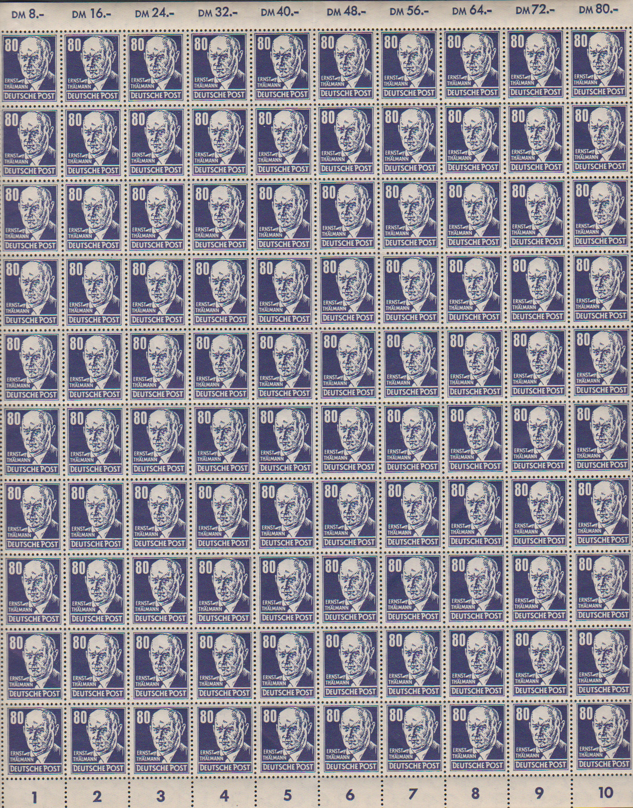80 Pfg. Köpfe im kompletten postfrischen Bogen mit zweimal Plattenfehler II und einmal IV. Mi. lose 1792,- + Ränder etc.