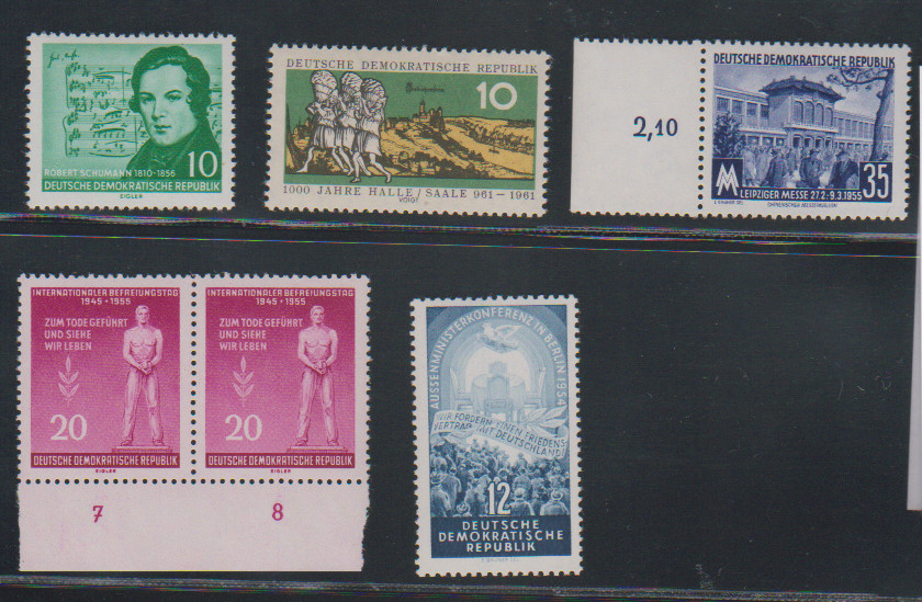 Sechs bessere postfrische, bei den guten Varianten gepr. Ausgaben: Nr. 424YII, 448aXI, 460YII (Unterrandpaar), 541XI, 833X und Kleinbogen 1238I. Mi. 560,-