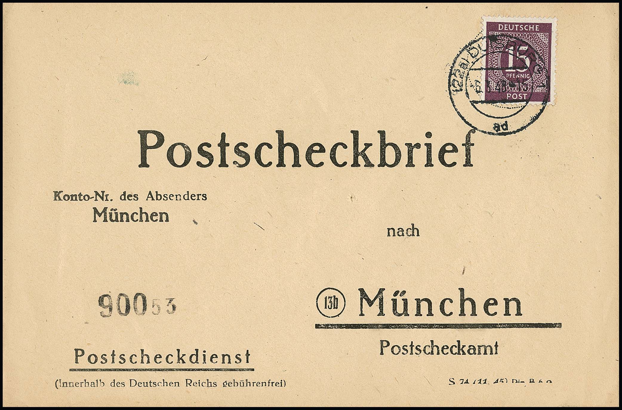 15 Pfg. lila bzw. grün, zwei seltene Einzelfrankaturen auf Bedarfs-Postscheckbriefen
