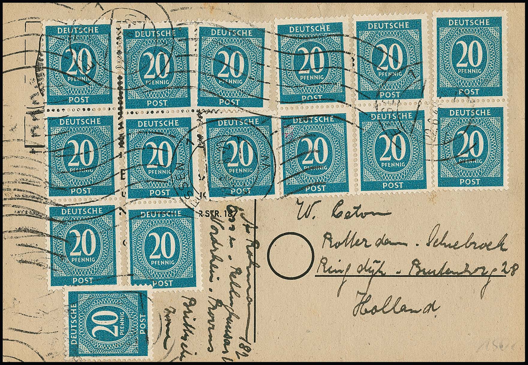 20 Pfg. per 15 als gute 10-fach-Mehrfach-Frankatur auf Bedarfs-Auslandskarte von Essen, 22.6.48, nach Holland