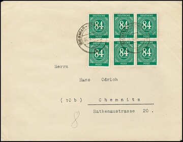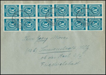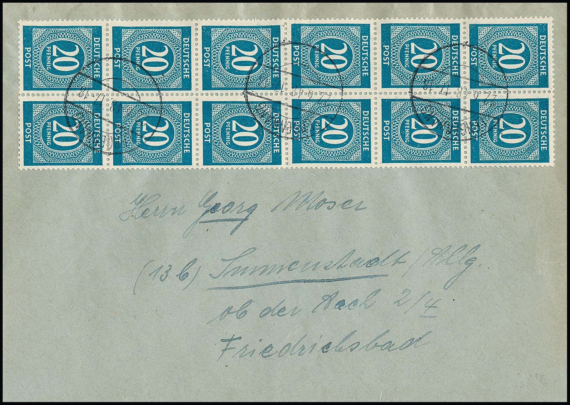20 Pfg. im 12er-Block als 10-fach-Mehrfach-Frankatur auf Brief aus Langenwang, 22.6.48, sign. Schlegel
