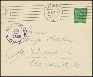 15 Pfg. grün (ein kurzer Zahn) als sehr seltene Einzelfrankatur auf Zensur-Auslands-Drucksache von Hamburg, 4.8.47, nach Zürich/Schweiz. Nur fünf Monate vom 1.4.47 bis 14.9.47 möglich! Mi. 1000,-