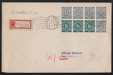 Elf versch. Belege je mit besseren Zehnfach-Mehrfach-Frankaturen Ost (SBZ-Verwendung): Nr. 923 per 10 als MeF, 924(12), 928 per zwei, 936 (4 und 6), 944 per 40 (!), 946(12), 950(12), 954(4), 957(3) u. 958(3)