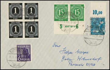 15 Pfg. im Unterrand-Paar mit HAN "4042.46 2", nebst weiterer Frankatur, u.a. Bizone 20 Pfg. Netz vom Oberrand (POR), auf portoger. Brief aus Kupferzell, Mi. 225,- +