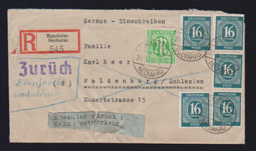 16 Pfg. per fünf, nebst Bizone 5 Pfg., auf R-Brief von Mannheim, 20.3.46, nach Schlesien und retour (Aufkleber "Kein Postverkehr"), Gebrauchserhaltung