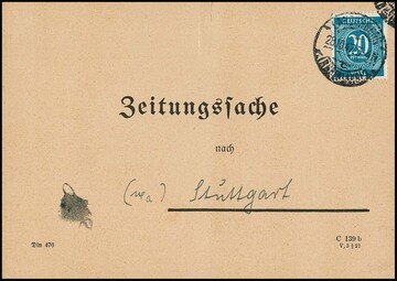 20 Pfg. Ziffern, zwei seltene Einzelfrankaturen, auf Zeitungssache und auf Posteinlieferungsschein (sign. Schlegel)