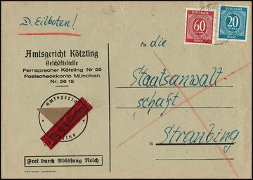 20 und 60 Pfg. auf Bedarfs-Expreßbrief des Amtsgerichtes Kötzting 1947, als Gerichtsbrief portofrei und nur die Expreßgebühr verklebt