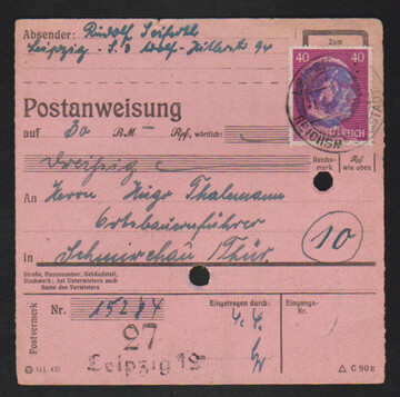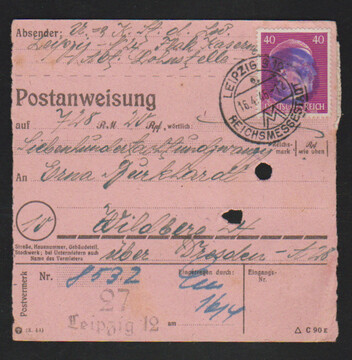 Leipzig, drei frühe Postanweisungen: Paar 15 Pfg. Hitler vom 14.4.45 (Auslieferung 29.7.), sowie zwei PA vom 16.4.45, Auslieferung in Dresden 8.5.45