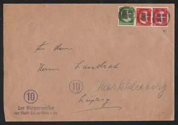 Leipziger Botenpost, 10.9.45, seltener portofreier Brief zwischen der Sowjetischen Militäradministration in Leipzig Gohlig und dem Oberbügermeister, mit entspr. kyrill. Botenpoststempel befördert