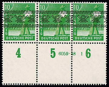 10 Pfg. Arbeiter-Bandaufdruck im postfrischen Unterrand-Dreierstreifen mit sowohl HAN als auch allen drei Werten mit vierseitig gezähnten Leerfeldern, Mi. 1150,-