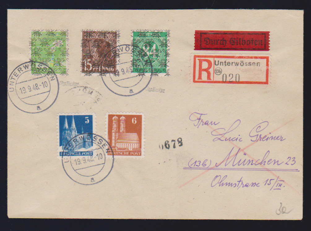 30 Pfg. Ziffern-Netzaufdruck, fünf meist verschiedene Einzelfrankaturen: auf zwei Auslandskarten ins Saarland bzw. in die CSSR, auf Streifband der 4. Gewichtsstufe (selten!), auf Überseebrief, sowie als Lagergebühr auf "Gebühr bezahlt"-Paketkarte (sehr seltene Variante!) in den Landbezirk nach Lippstadt