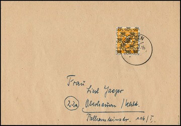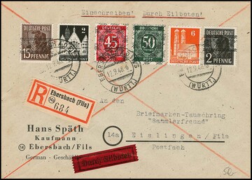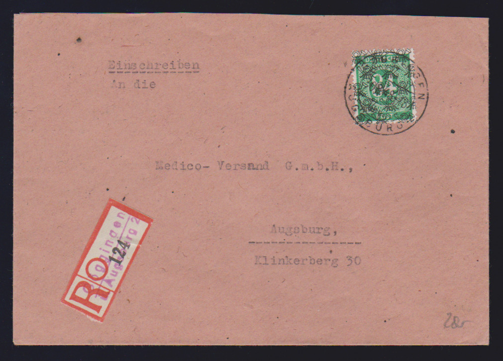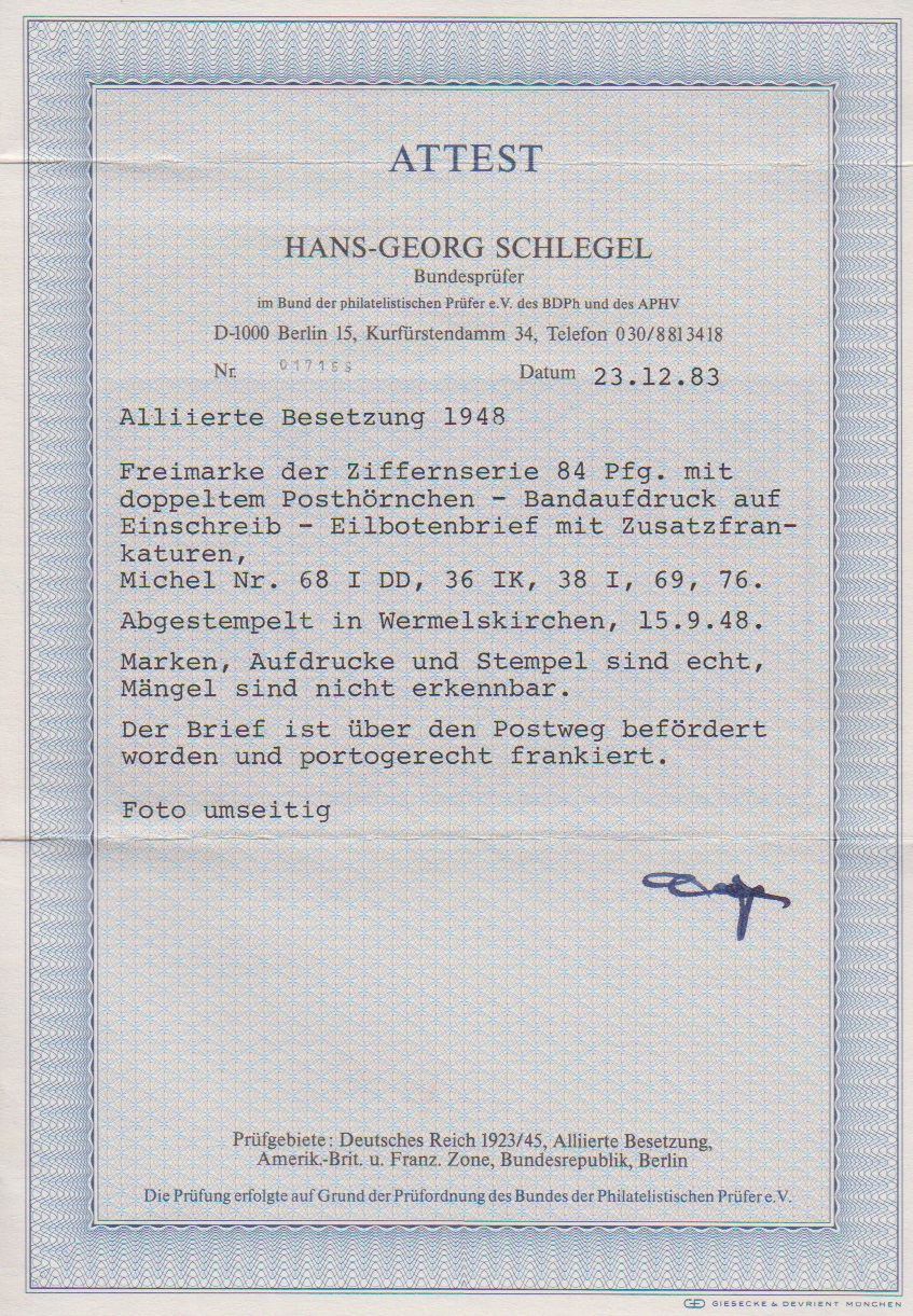 84 Pfg. Ziffern mit doppeltem Bandaufdruck, nebst weiterer Frankatur, u.a. 6 Pfg. Arbeiter mit kopfstehendem Bandaufdruck, auf portoger. Orts-R-Expreßbrief aus Wermelskirchen, Attest Schlegel. Mi. 450,- +