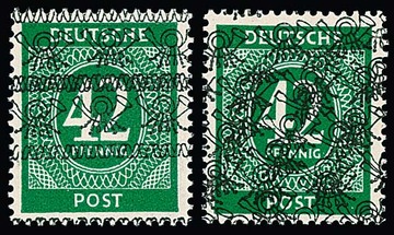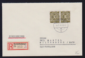 30 Pfg. Ziffern-Netzaufdruck, zwei Paare vs./rs. als gute MeF auf Bedarfs-Paketkarte aus Salzkotten 1948, sowie im Paar auf sauberem R-Brief aus Aschaffenburg