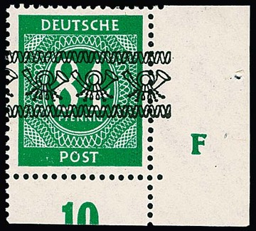 84 Pfg. Ziffern-Bandaufdruck postfrisch aus der rechten unteren Bogenecke mit Druckerzeichen "F", Mi. "-.-", Attest D. Schlegel