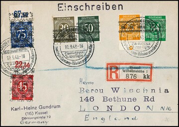 45 u 75 Pfg. Ziffern-Netz, je vom Oberrand PORdgz, nebst 25, 30, 50 u. 84 Pfg. Ziffern-Band, auf Sammler-R-Brief von Kassel nach London. Mi. lose 332,-