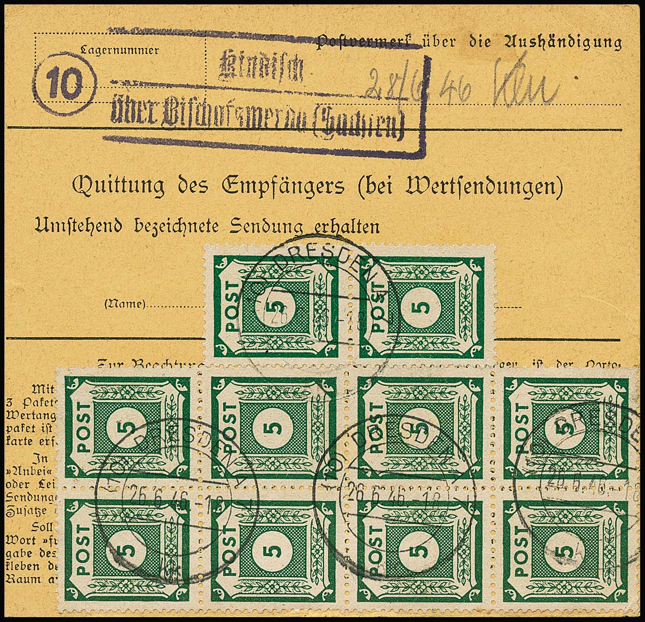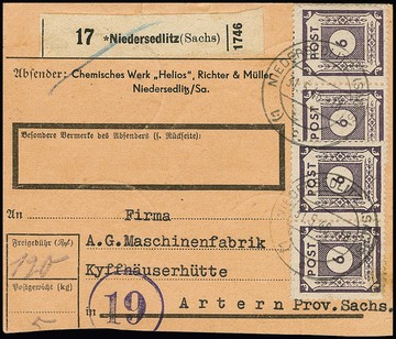 6 Pfg. per 20 in Einheiten, vs./rs. auf typischer Paketkarte ab Niedersedlitz, 31.5.46, hohe MeF!