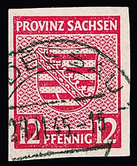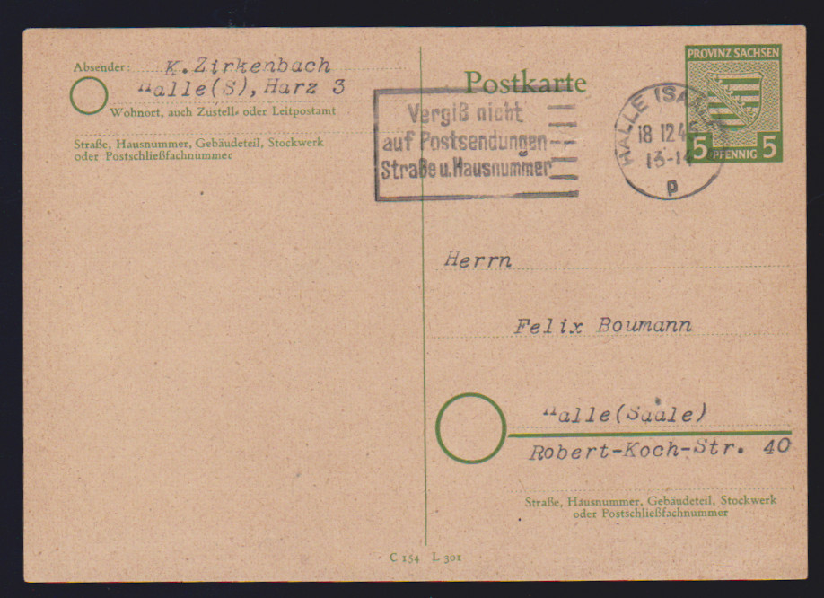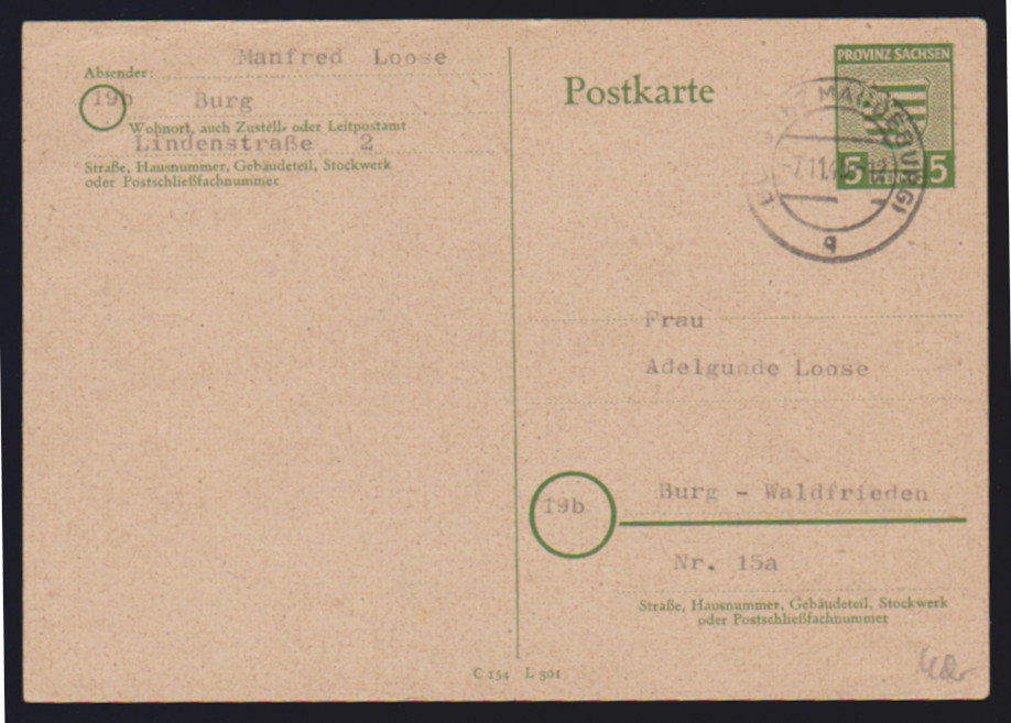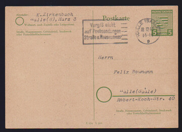 Wappen-Ganzsachenkarte 5 Pfg. zweimal gebraucht als Ortskarten aus Burg b. Magdeburg, 7.11.45, und Halle, 18.12.45. Mi. 300,-