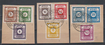 Freimarken, gez. Coswig L10, kpl. Serie, dabei 12 Pfg. in besserer b-Farbe, auf Briefstücken, sign. Ströh. Mi. 340,-