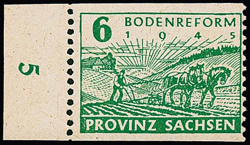 6 Pfg. Bodenreform, lebhaftgrün mit nachträglicher senkrechter Zähnung von Wittenberg tadellos postfrisch vom linken Bogenrand, Attest Jasch. Eine seltene Marke! Mi. 1500,-