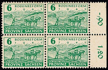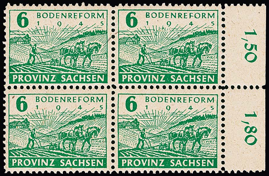 6 Pfg. Bodenreform, vierseitig gezähnt, Papiere w, x und y je in postfrischen Rand-Viererblöcken, je sign. Jasch, seltenes Angebot. Mi. 1840,- +