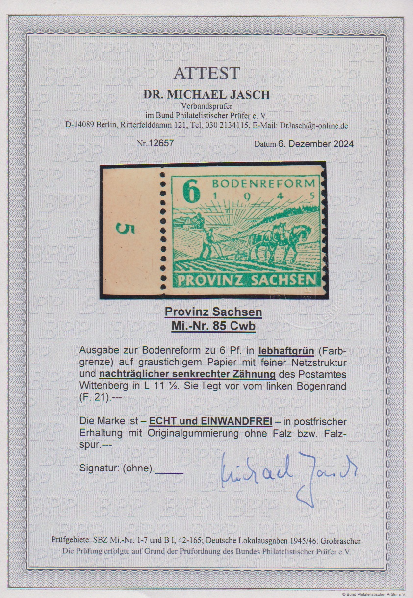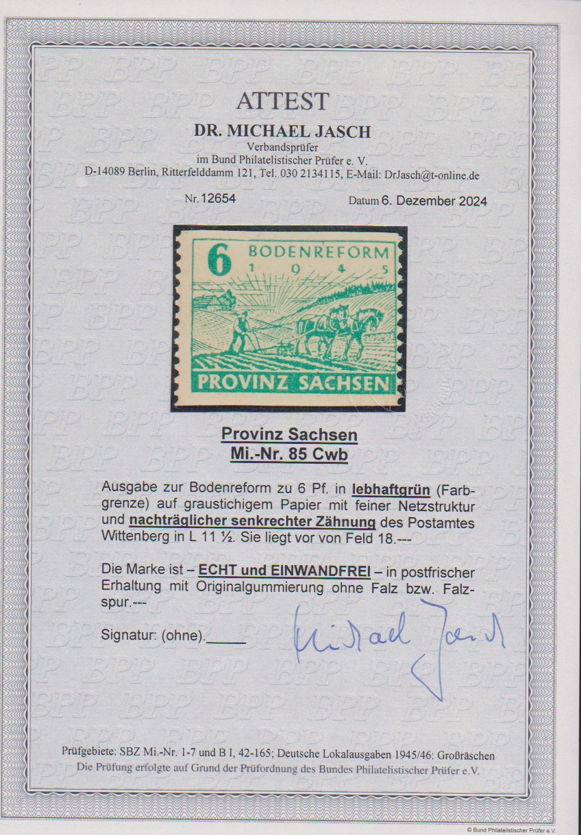 6 Pfg. Bodenreform, lebhaftgrün mit nachträglicher senkrechter Zähnung von Wittenberg tadellos postfrisch, Attest Jasch. Eine seltene Marke! Mi. 1500,-
