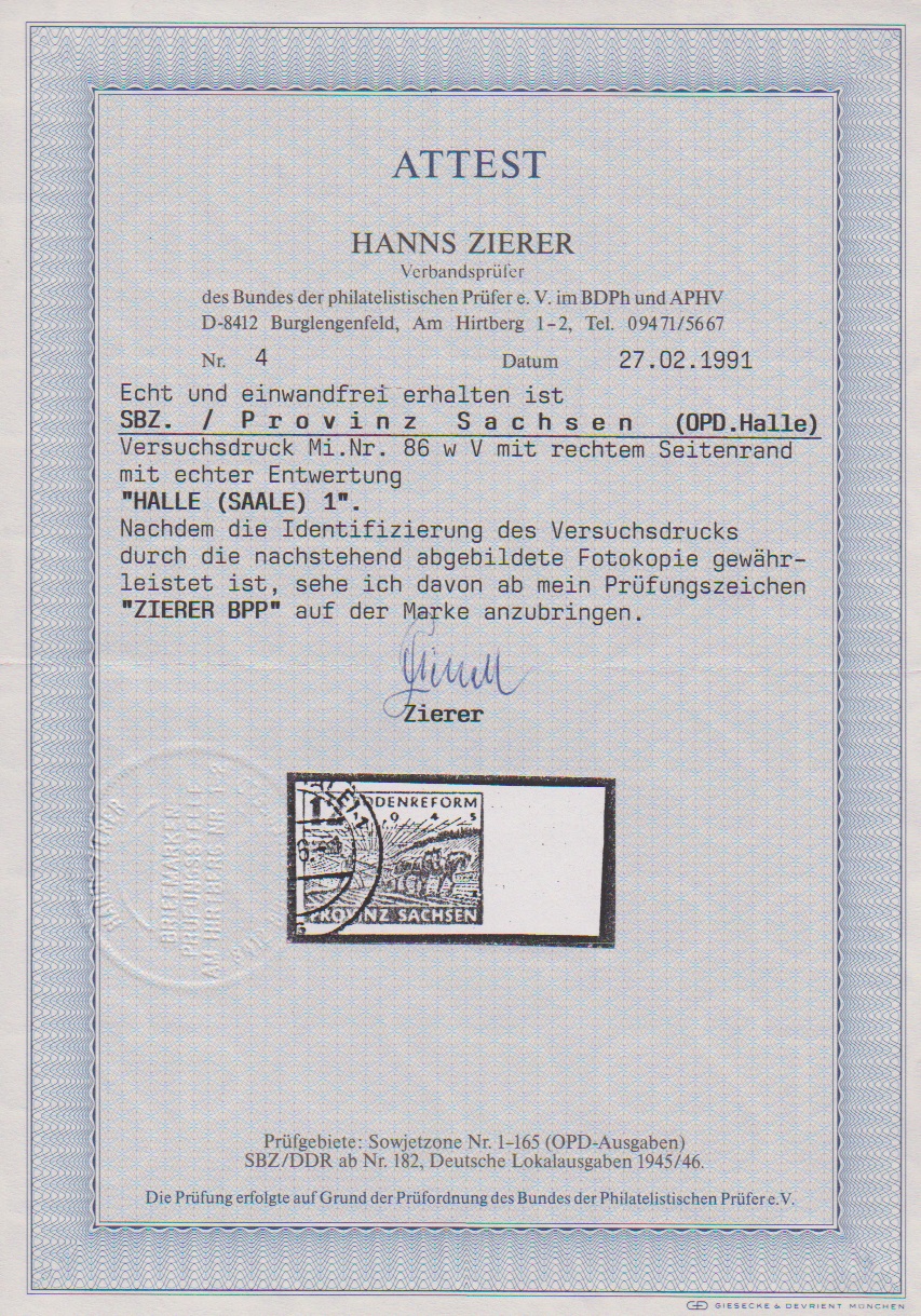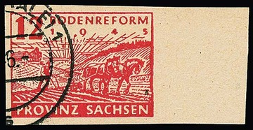 12 Pfg. Bodenreform, Versuchsdruck in schwarzrosarot gestempelt mit breitem rechtem Bogenrand, Stempel "Halle 1", sign. mit Attest Zierer. Mi. 2500,-