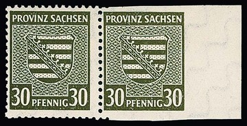30 Pfg. Provinzwappen im postfrischen Randpaar (nur im Bogenrand leichter Fingerabdruck), die Randmarke dreiseitig ungezähnt (siehe Foto), Attest Jasch. Mi. 800,-