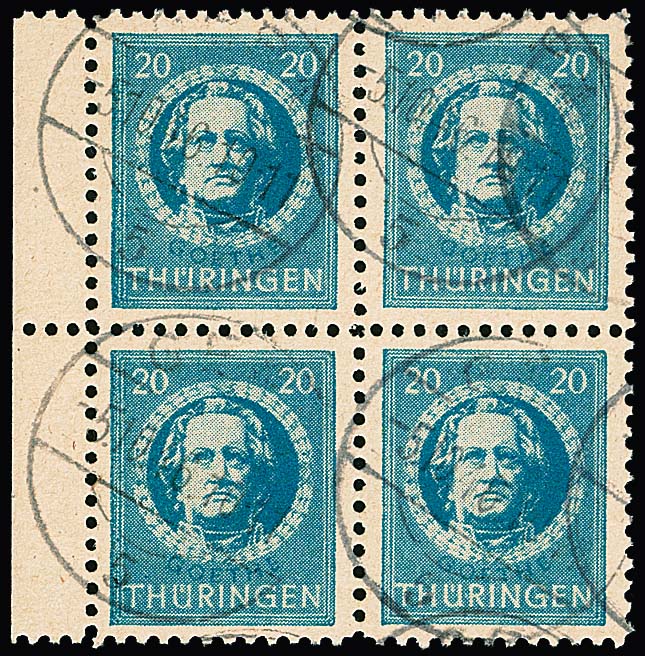 20 Pfg. preußischblau, gutes Papier, im tadellos gestempelten Viererblock vom linken Rand, Attest Schulz. Mi. 1000,- +