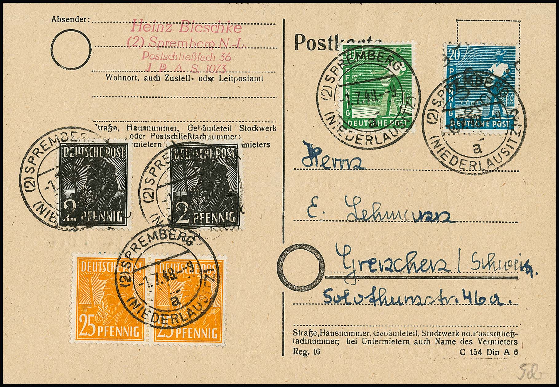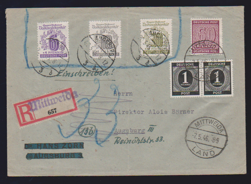 6, 10 u. 30 Pfg. Volkssolidarität, nebst Nr. 137 und Paar Kontrollrat 1 Pfg. Ziffern, auf R-Brief von Mittweida nach Augsburg. Die drei Volkssol. erst nicht anerkannt und Brief mit Nachgebühr "33" (Pfg.) versehen, dann in Augsburg nachträglich entwertet und Nachgebühr gestrichen