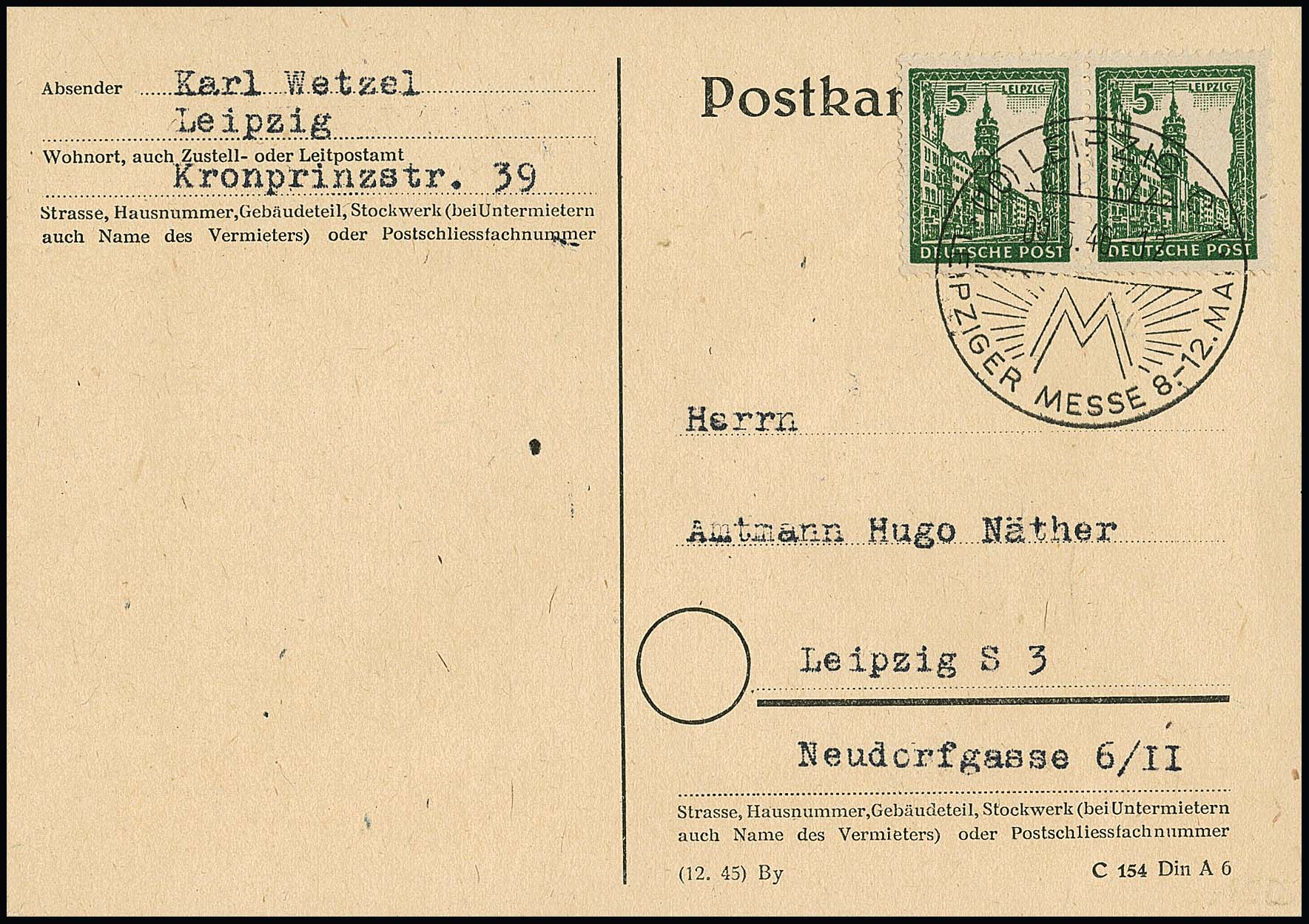 5 Pfg. Abschied, x-Papier, im Paar auf Orts-Postkarte von Leipzig, sign. Ströh. Mi. 450,-