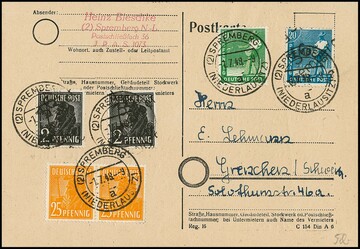 Bezirkshandstempel, fünf bessere Belege: Nr. 166IV(3) und 167IV(3) auf R-Brief, 166VII(2), 173VII nebst Kontrollrat 946 u. 952(2) auf Auslandskarte, 170I nebst Bizone Nr. 933(10) auf R-Brief, 172V auf Ortsbrief, sowie Nr. 170X(2) auf Brief "41 Schwarzenberg Land"