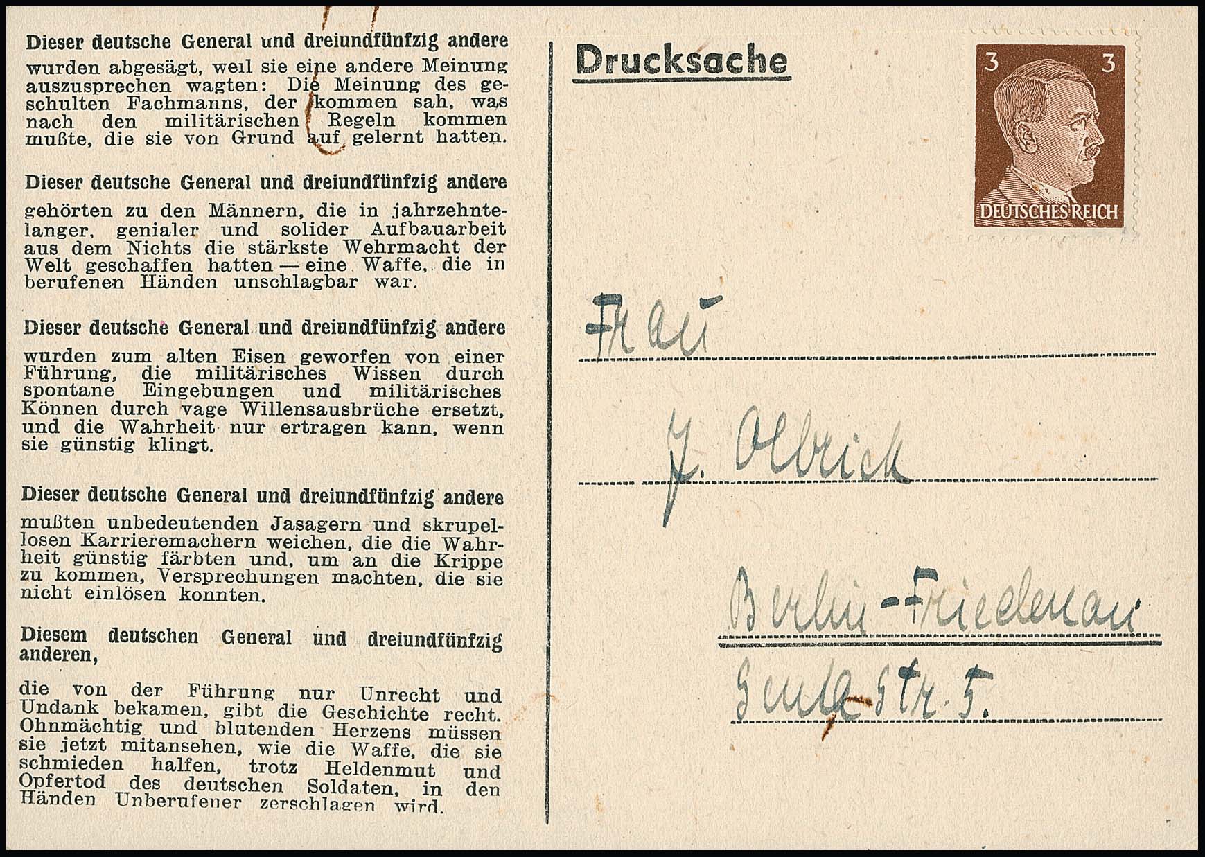 Britische Propagandafälschung für Deutschland, 3 Pfg. Hitler auf Karte "Kaltgestellter Generaloberst" Halder, diese adress-seitig unbedeutende Rostklammerspur. Mi. 450,-, Attest Pieles