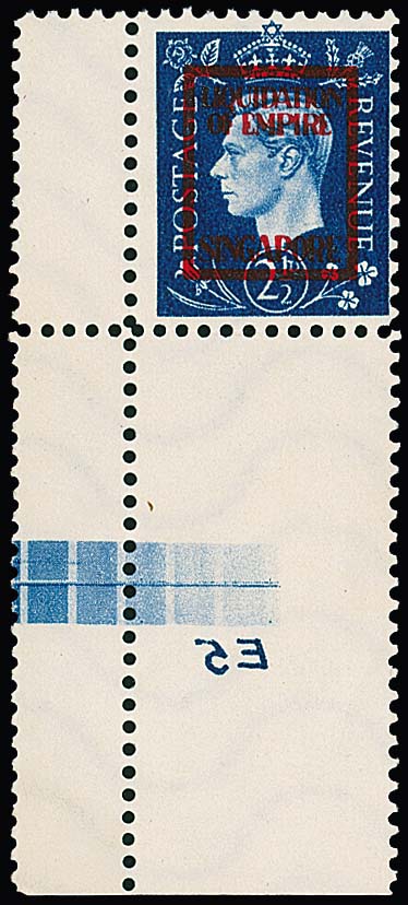 Deutsche Fälschungen für England, 2 1/2 P. blau, Georg mit Aufdruck "Singapore" als wie verausgabt ungebrauchte linke untere Bogenecke mit Druckvermerk "E5" spiegelverkehrt, selten und im Michel ohne Bewertung