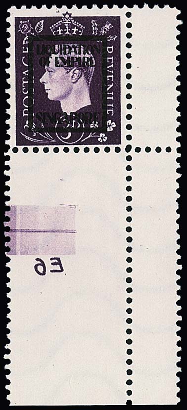 Deutsche Fälschungen für England, 3 P. violett, Georg mit Aufdruck "Singapore" als wie verausgabt ungebrauchte rechte untere Bogenecke mit Druckvermerk "E6" spielgelverkehrt. Selten und im Michel ohne Bewertung