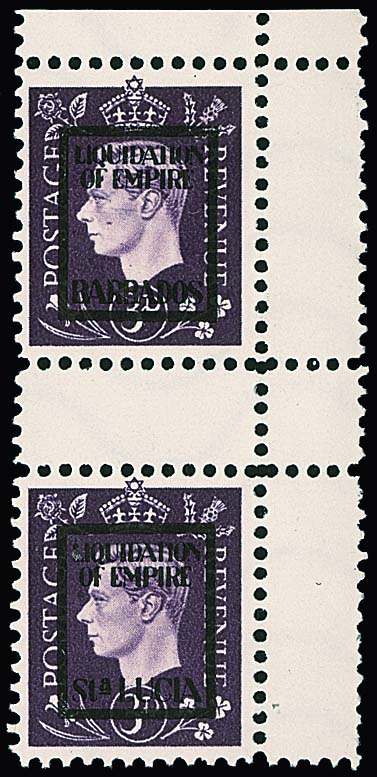 3 P. Georg, Zusammendruck "Barbados" und "Sta. Lucia" im wie verausgabt ungebrauchtem Paar vom rechten Bogenrand, Mi. lose 280,- +