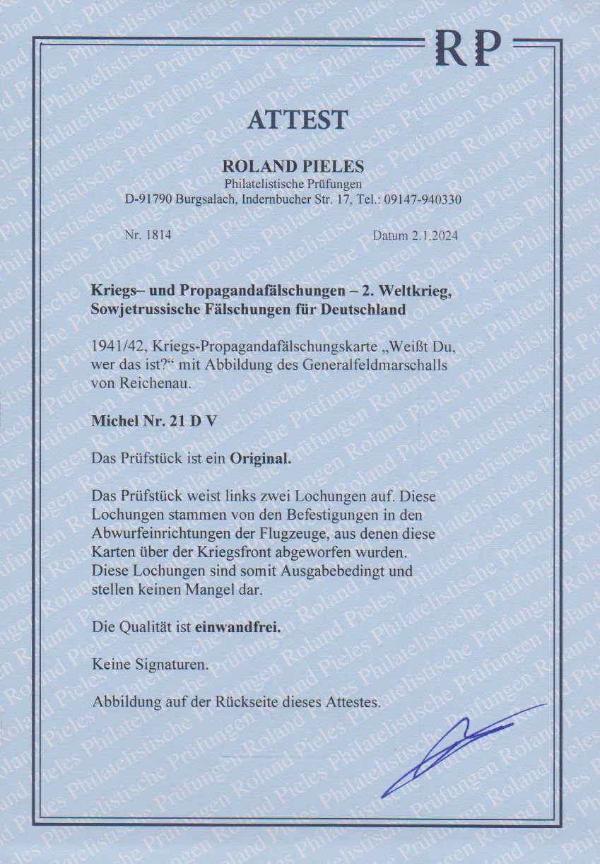 Sowjetische Fälschung für Deutschland, Propagandafälschungskarte mit Abb. Generalfeldmarschall von Reichenau tadellos ungebraucht ohne die sonst üblichen abwurf- und auffinde-bedingten Mängel mit typischen Befestigungspunkten. Attest Pieles "einwandfrei", in dieser Erhaltung selten! Mi. 1700,-