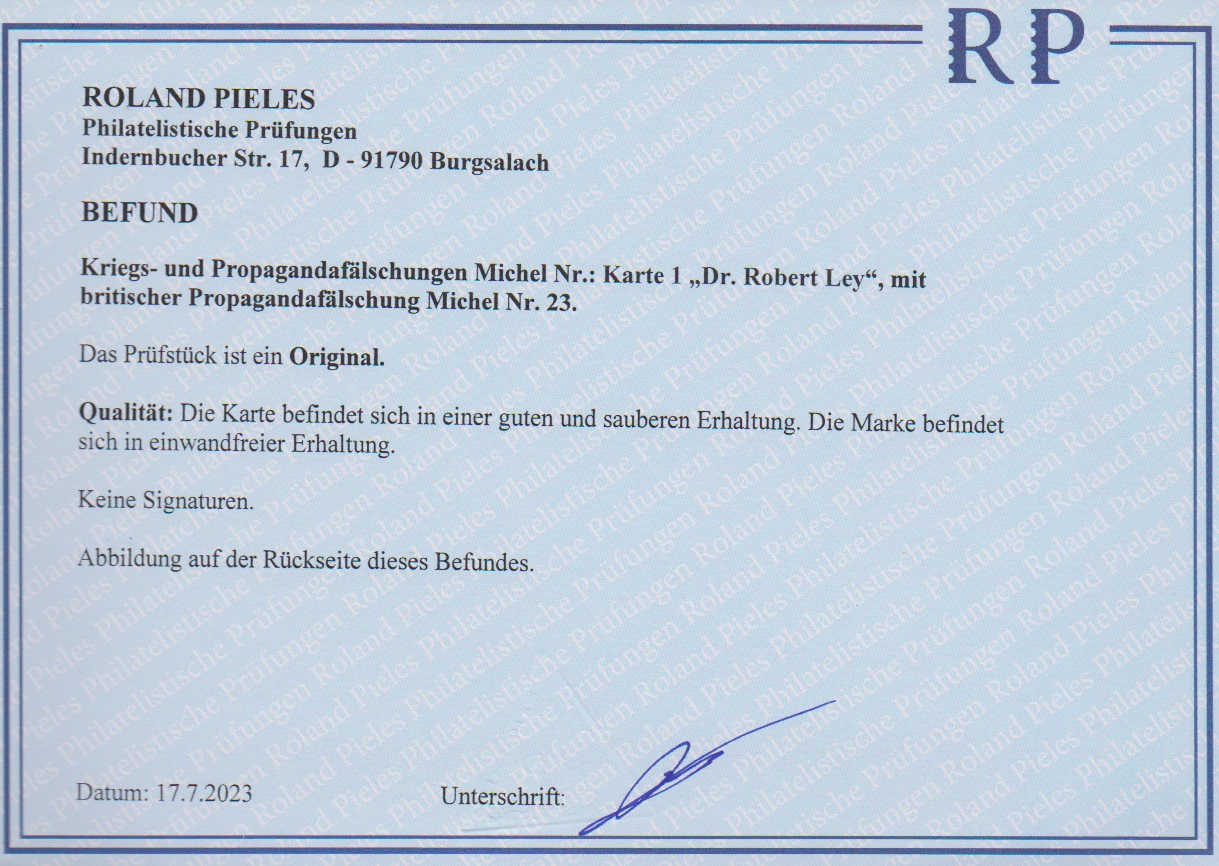 Britische Propagandafälschung für Deutschland, 3 Pfg. Hitler auf Karte "Dr. Robert Ley", Fotoexp. Pieles. Mi. 200,-