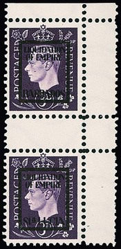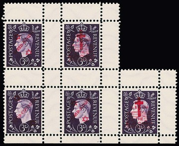 Deutsche Fälschungen für Großbritannien, 3 P. Georg, Aufdrucke "World-Capitalism", sowie "World-Judaism" und "The Bluff Charta" je zweimal, alle zusammen innerhalb eines Fünfer-Zusammendruckblocks. Die Auflage betrug nur je 30 Serien, so dass eine derartige Einheit zu den großen Seltenheiten des Sammelgebietes gehört! Attest Pieles (Mi. lose 3100,- ++)