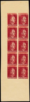 12 Pfg. Hitler mit Totenkopf, Propagandafälschung, Doppeldruck-Einheit, der zweite Druck die Fälschung der Normalmarke, im ungebrauchten Rand-Zehnerblock ungeklärter Herkunft