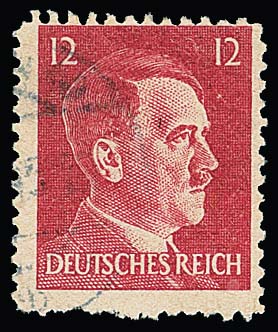 Amerikanische Fälschung für Deutschland, 12 Pfg. Hitler in der ausgabetypisch unregelmäßigen Zähnung zart gest. Mi. 300,-
