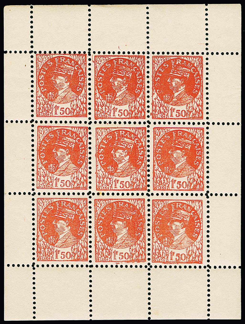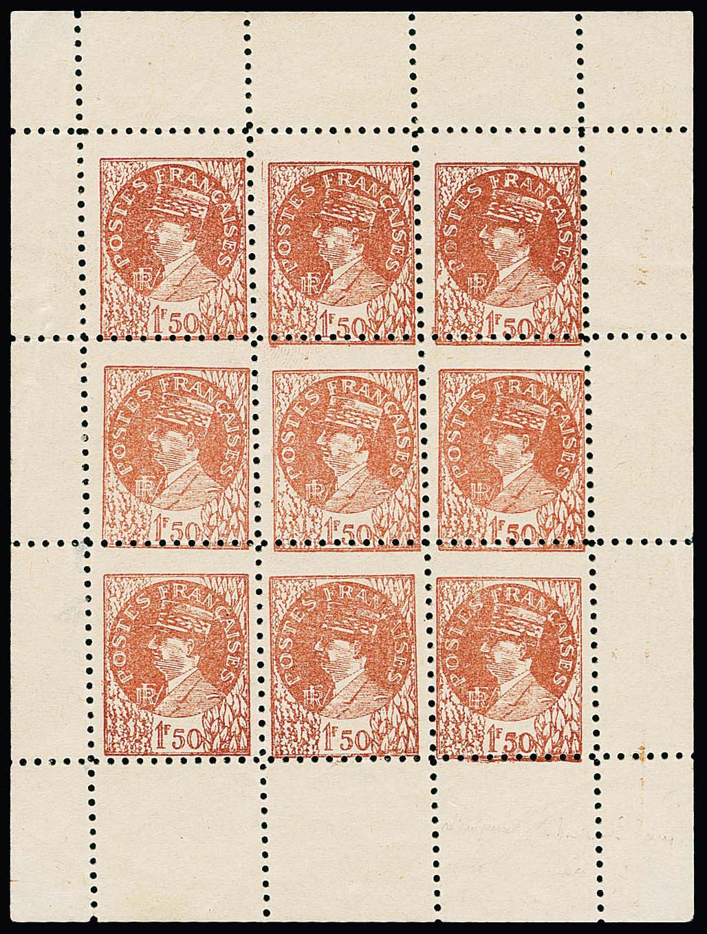 Fälschungen von Widerstands-Organisationen, 1,50 Fr. Petain im vollständigen postfrischen Kleinbogen zu neun Werten, im Aussenrand kl. getönte Stelle, Marken tadellos, als Bogen selten! Attest Pieles. Mi. 900,-