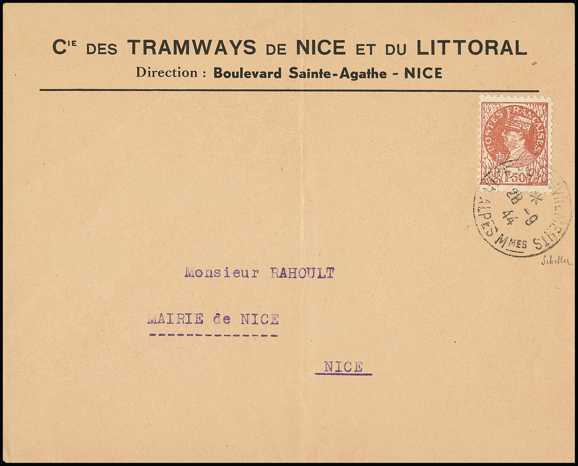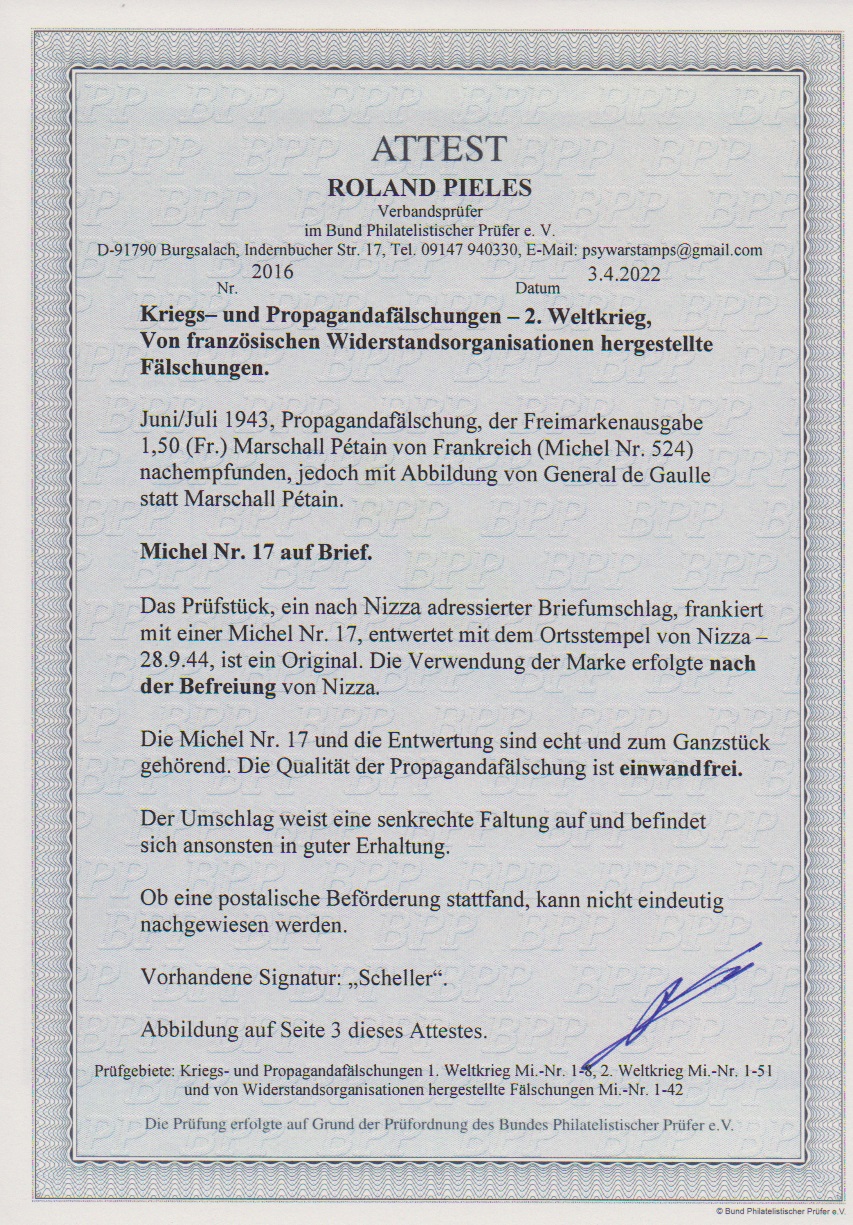 Fälschungen französischer Widerstands-Organisationen, 1,50 Fr. Petain auf Couvert (senkrechte Faltspur ausserhalb) mit Stempel von Nizza, 28.9.44. Schon lose gestempelt äusserst selten und im Michel nur mit "-.-" notiert. Sign. Scheller und Attest Pieles