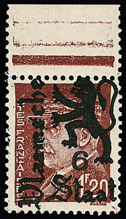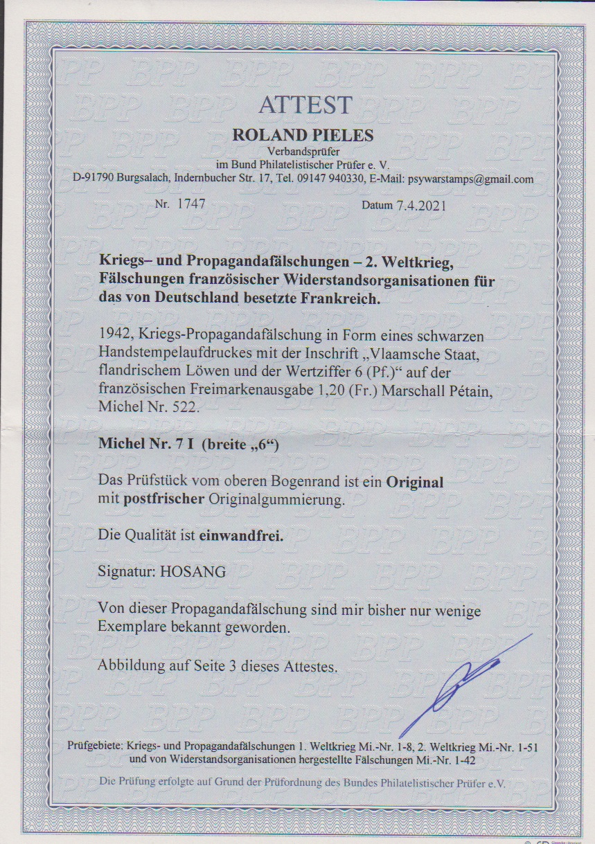 Fälschungen französischer Widerstandsorganisationen für das von Deutschland besetzte Frankreich, "6" Pfg. auf 1,20 Fr. Petain, "breite 6" im Aufdruck, tadellos postfrisch vom Oberrand, eine nur in wenigen Exemplaren bekannte Marke. Sign. Hosang und Attest Pieles. Mi. "-.-"