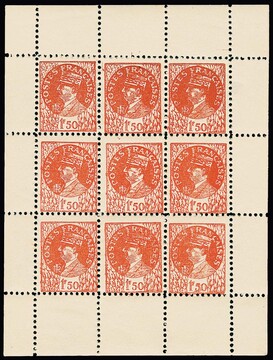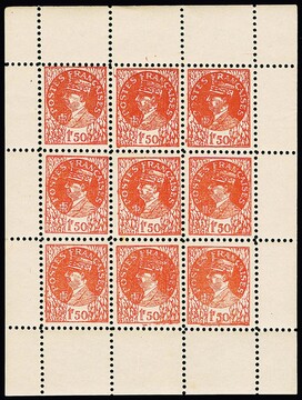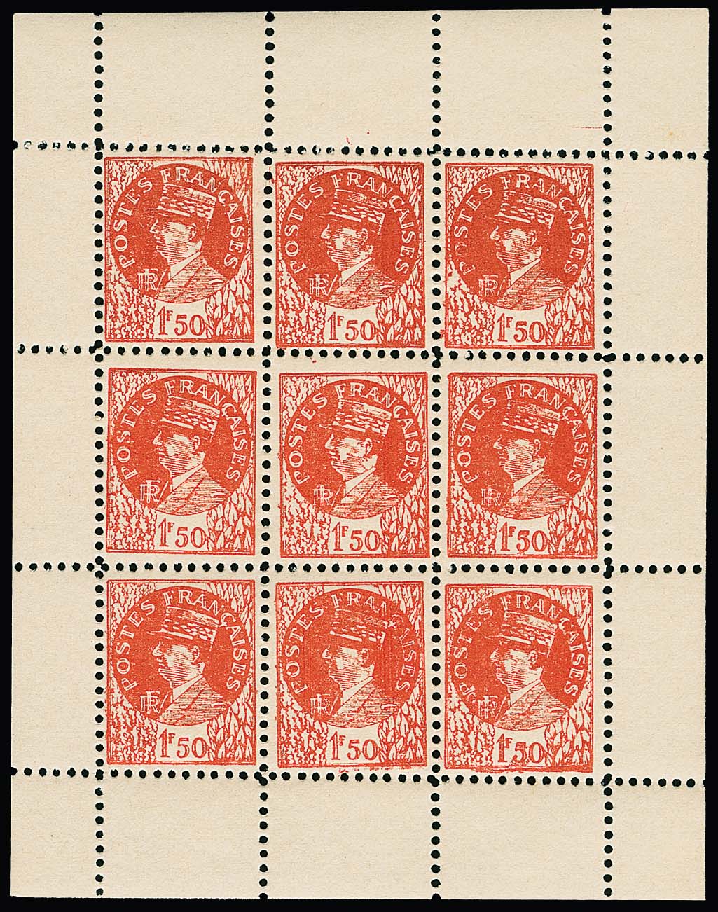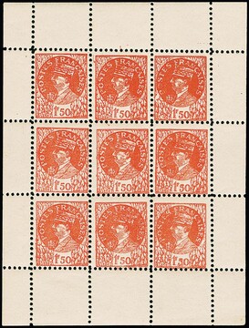 Fälschungen französischer Widerstandsorganisationen für das von Deutschland besetzte Frankreich,1,50 Fr. rotbraun, sog. "Nizza-Fälschung" mit Abb. Charles de Gaulle im kpl. postfrischen Kleinbogen (lediglich im Rand kleine Haftspuren bzw. dünne Stellen), Mi. 900,-